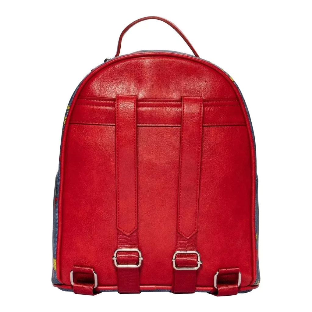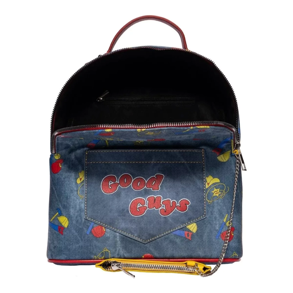 Chucky te quiere a ti para ser su nuevo mejor amigo, con esta exclusiva mochila con monedero incluido, la mochila tiene un diseño inspirado en el overol de mezclilla del chico bueno, mientras que el monedero asemeja al empaque del juguete como se mostró en la película. Cuenta con correa ajustable y una medida aproximada de 30cm x 25cm x 13cm.