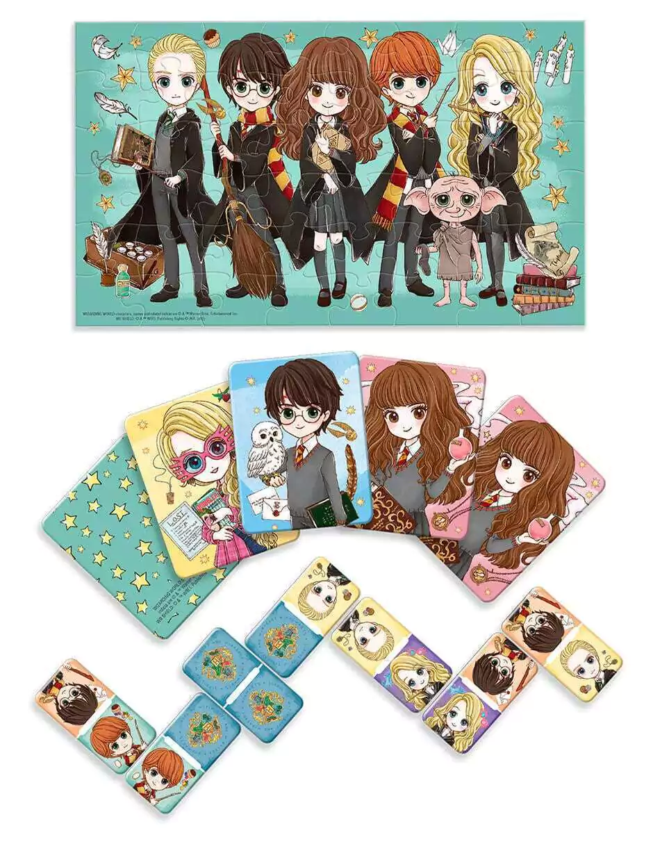 Este set de juegos inspirado en Harry Potter, incluye un juego de memoria de 24 tarjetas, un rompecabezas de 48 piezas y un domino de 28 fichas, un set con el que puede jugar toda la familia o amigos.
