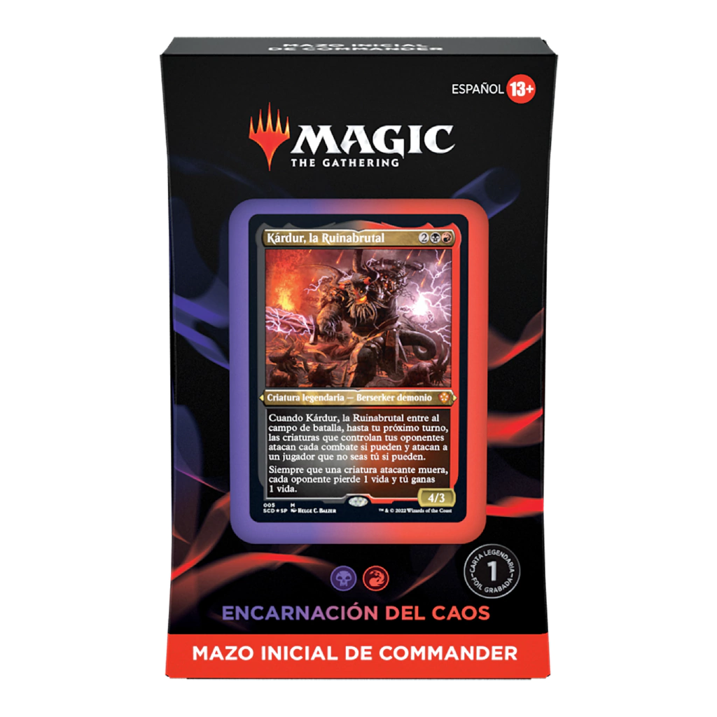 Cada Mazo inicial de Commander incluye 1 mazo listo para jugar de 100 cartas de Magic (1 carta legendaria foil grabada de comandante y 99 cartas no foil, tierras incluidas), 10 fichas de dos caras, 1 caja guardamazo, contadores destroquelables, 1 hoja con consejos estratégicos para usar el mazo, 1 resumen de las reglas para jugar a Commander y 1 tarjeta de referencia para consultar qué puedes hacer en tu turno.