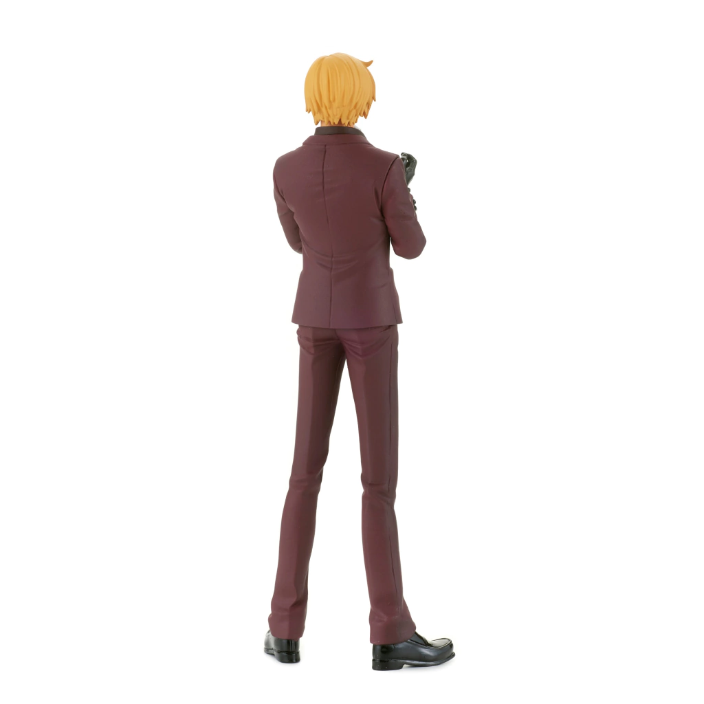 El cocinero de la tripulación de Luffy, Sanji, llega en esta figura de la línea "The Grandline Men" de Banpresto, basada en el arco de Wano, viste un traje de color guinda con guantes negros y su característico cigarrillo. Mide aproximadamente 17cm.