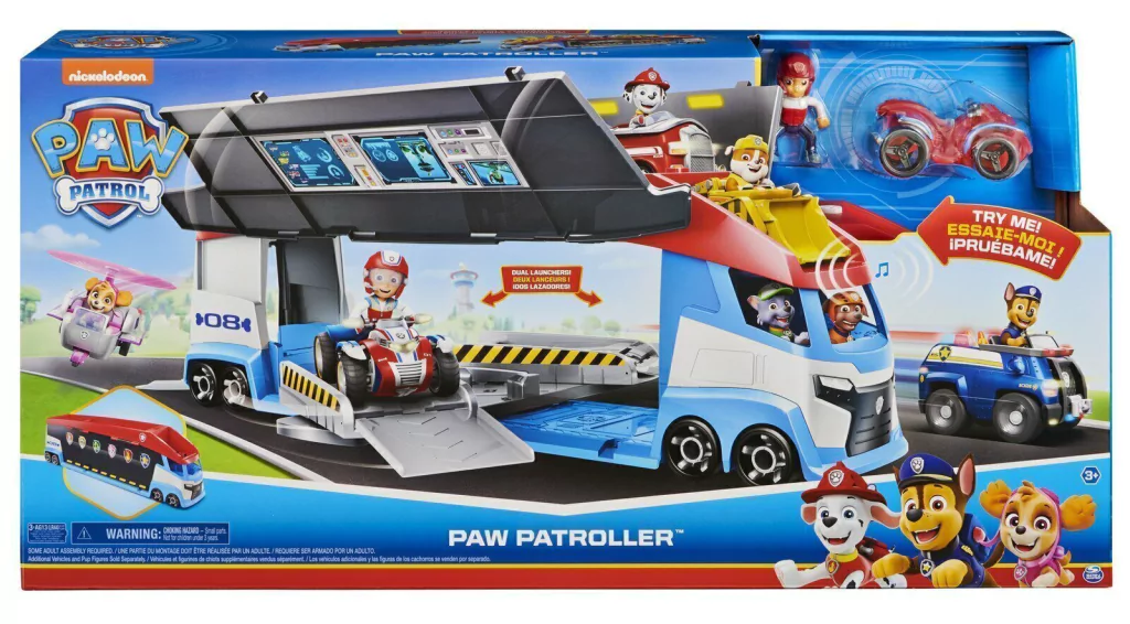 ¡Únete a Ryder y a los cachorros de Paw Patrol en aventuras de rescate! Cuenta con puertas transformadoras, lanzadores de vehículos duales y sonidos realistas. Los costados del vehículo se levantan, revelando dos lanzadores de vehículos.