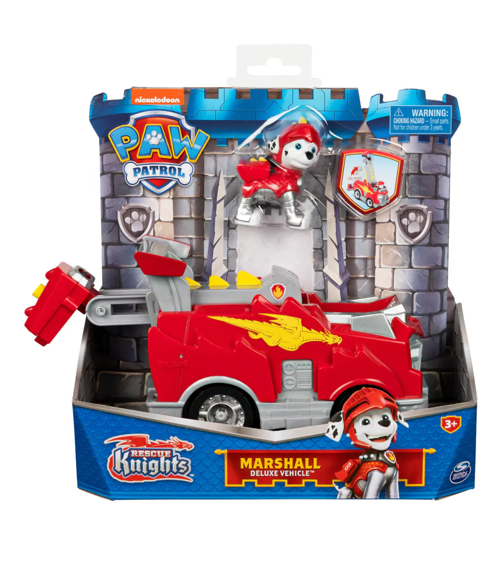 De Paw Patrol Caballeros Al Rescate, Marshall con su armadura y vehículo inspirado en un dragón, está listo para acudir al rescate, el vehículo cuenta con lanza dardos con 2 proyectiles. Mide aproximadamente 20cm de ancho.