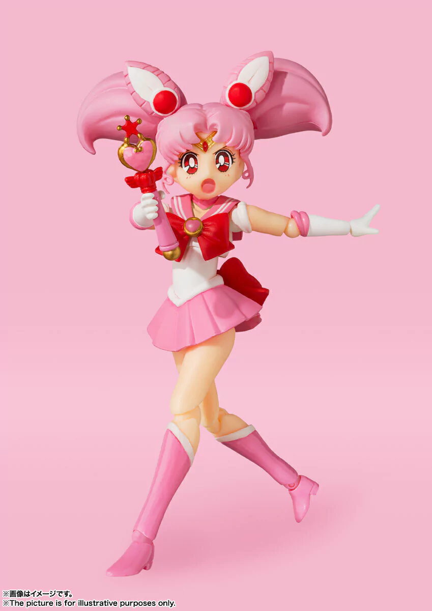 Sailor Chibi Moon vuelve a unirse a S.H.Figuarts, en una nueva edición especialmente coloreada para evocar su aparición en la serie animada de Sailor Moon de la década de 1990. Esta figura de acción altamente posable captura toda la ternura del personaje, con proporciones precisas y una nueva apariencia. El set incluye tres expresiones opcionales, cinco pares de manos opcionales, cabello opcional, Pink Moonstick y una base. Mide aproximadamente 10cm.