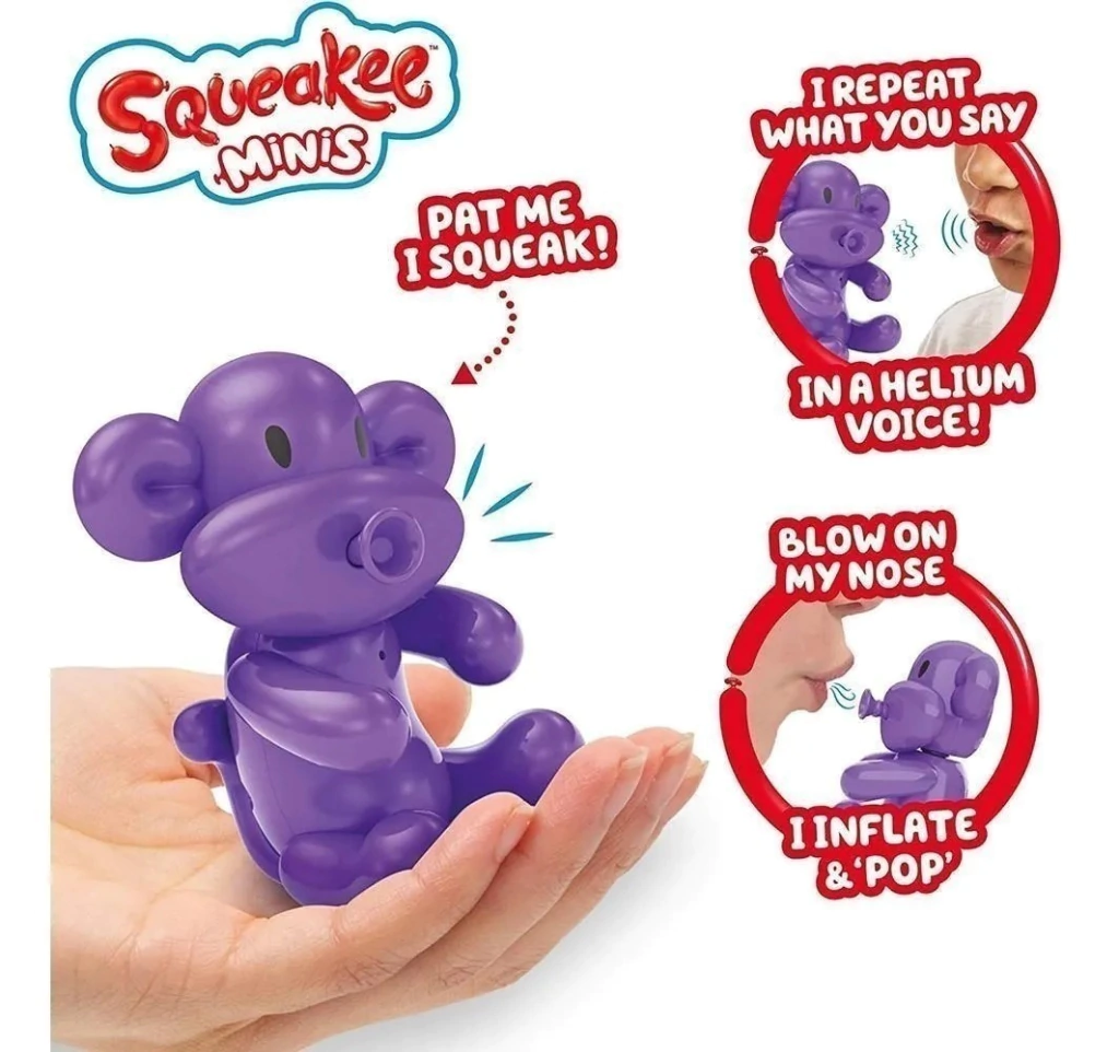 Squeakee Minis son nuevos lindos mini globos de animales llenos de diversión interactiva inspirada en globos. Billo el mono repetirá lo que dices con una divertida voz de helio. Sopla la nariz de tu mono para escucharlos inflados. Mide aproximadamente 8cm.