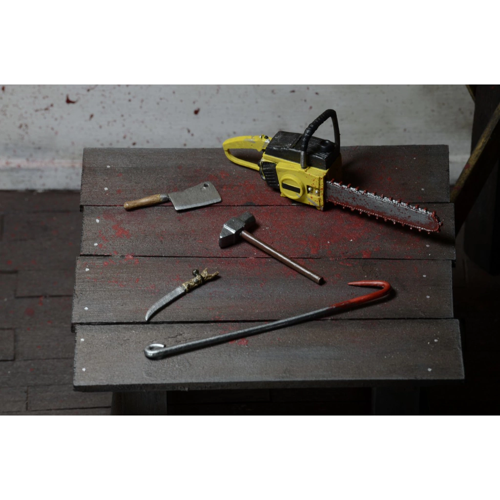 Leatherface viene con una motosierra, cuchillo, martillo, gancho de carne, cuchillo de carnicero y delantal de vinil. Altamente detallado viene en una caja con ventana para exhibición.